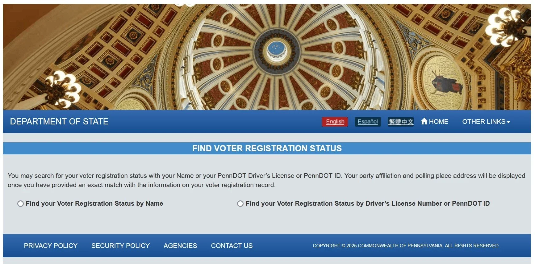 You may search for your voter registration status with your Name or your PennDOT Driver’s License or PennDOT ID.